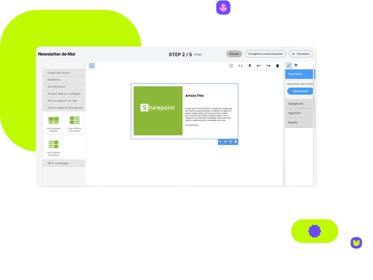Grâce à l’intégration native avec SharePoint, vous pouvez retrouver, sélectionner et diffuser vos contenus internes directement depuis votre espace de communication.